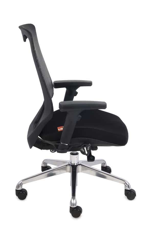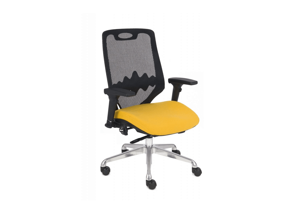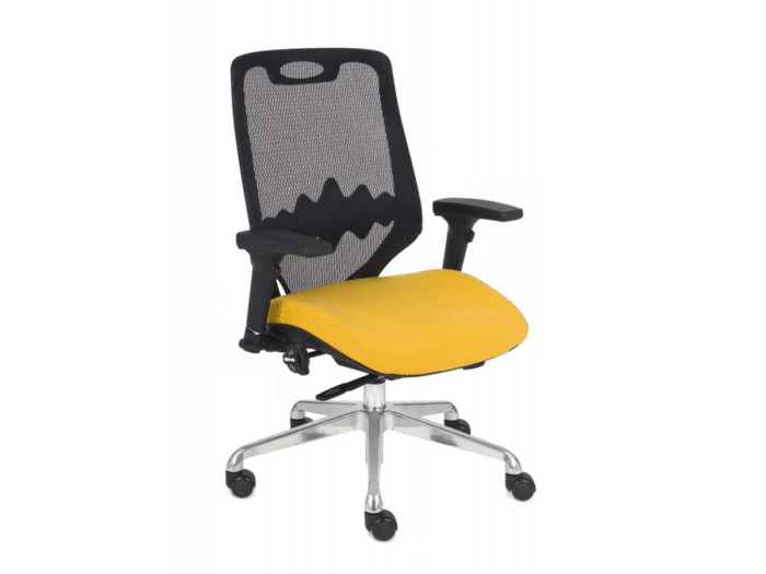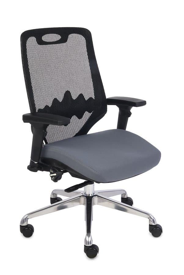 Krzesło biurowe zostało wyposażone w niemalże wszystkie dostępne obecnie rozwiązania, takie jak : regulowane podłokietniki w 4 płaszczyznach, regulowaną głębokość siedziska, regulacje profilu siedziska, synchroniczny mechanizm ruchowy zapewniający nieustanne podparcie pleców Użytkownika. Oparcie fotela wykonane zostało z praktycznej siatki, która dostosowuje się do pleców użytkownika zapewniając równocześnie odpowiednią cyrkulacje powietrza. W części lędźwiowej oparcie wyposażone jest w profil o regulowanej wysokości. Siedzisko jest tapicerowane, do Państwa dyspozycji oddajemy szeroką gamę trwałych tkanin w wielu kolorach.