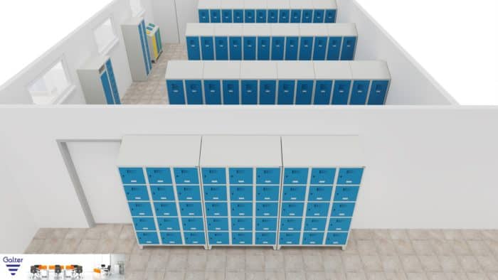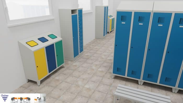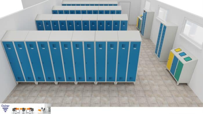 PROJEKT: ergonomiczny projekt szatni z wykorzystaniem szaf metalowych BHP ubraniowych, podstaw metalowych szatniowych,szaf skrytkowych metalowych, szafy na odzież brudną tzw. brudownik, pojemniki do segregacji śmieci oraz stojak na płyn do dezynfekcji.