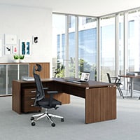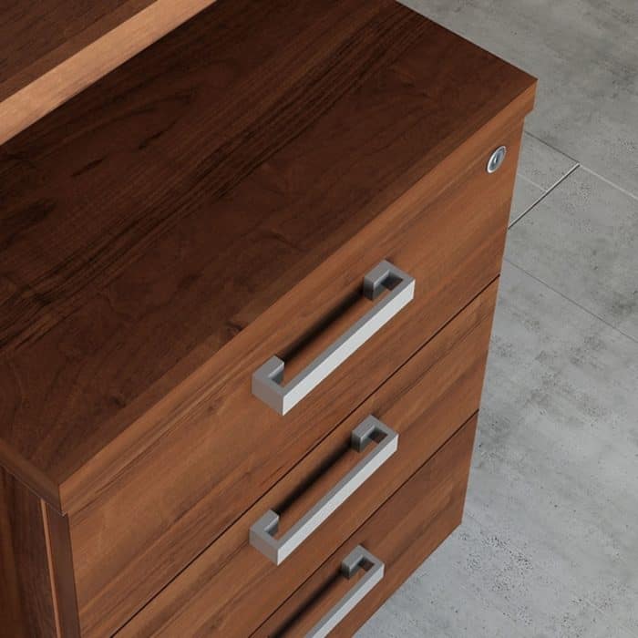 Klasyka zawsze na czasie – meble gabinetowe ECHO to ponadczasowa forma i uniwersalna kolorystyka. Gustowna barwa orzecha nizinnego stanowi nawiązanie do tradycyjnych wzorów, podkreślając wysoką jakość wykończenia. Elementy metalowe wprowadzają nowoczesny akcent. Charakterystyczny dla kolekcji dystans pomiędzy blatem a nogami nadaje całości lekkość.
