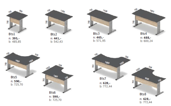 Biurka w tym systemie zbudowane są na stelażu metalowym, lakierowanym proszkowo, wyposażone są w osłony. Dostępne są proste i kątowe blaty biurek. Powierzchnię użytkową blatów łatwo można powiększyć stosując dostawki lub kontenery dostawiane do biurek. Biurka można zestawiać uzyskując różne, łatwe do rozbudowy stanowiska pracy (przykłady zestawień). Uzupełnieniem dla systemu są regały biurowe.