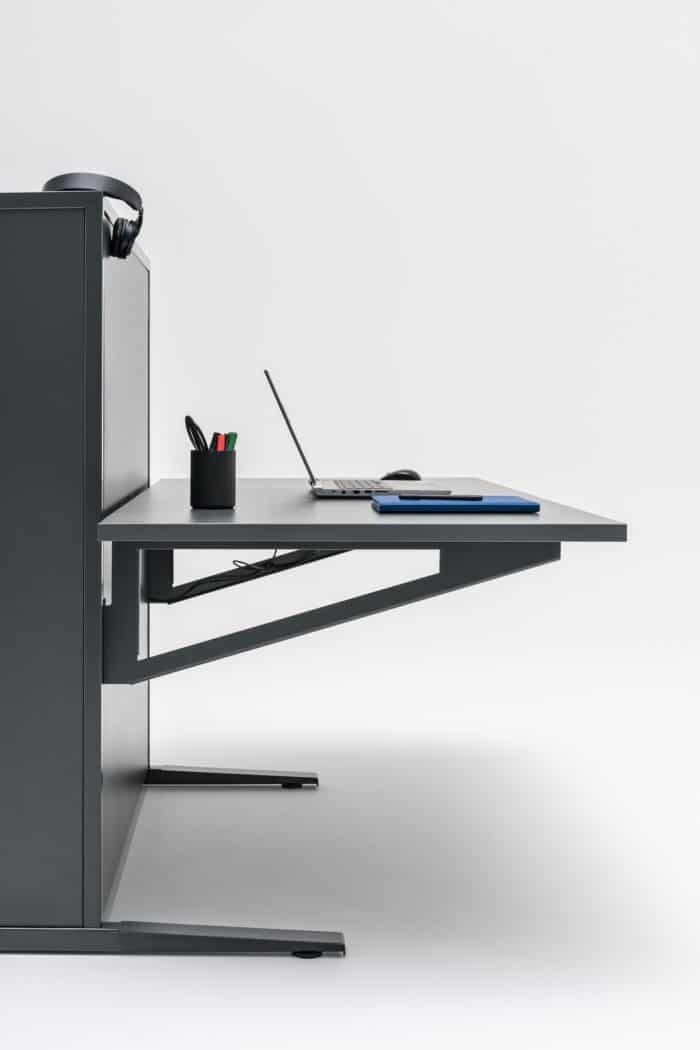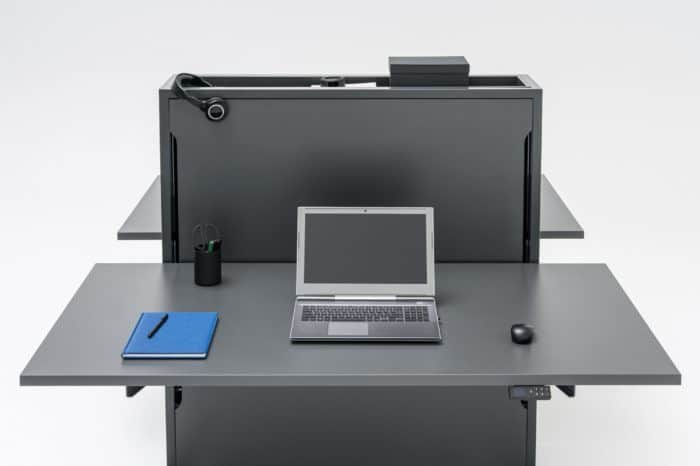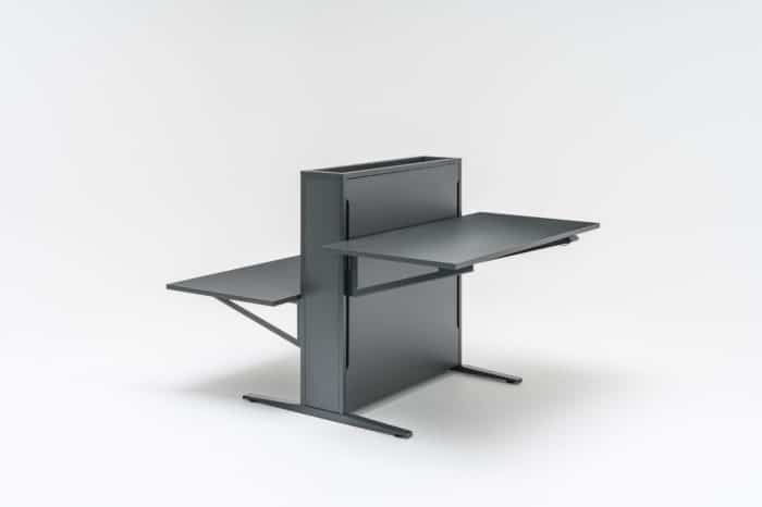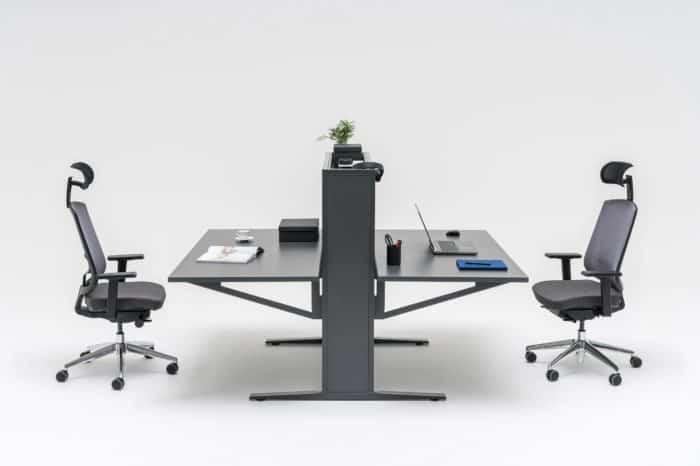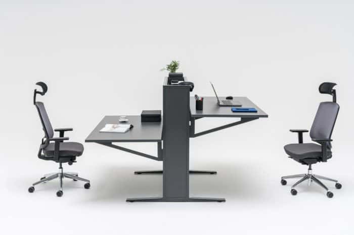 Innowacyjne i nowoczesne biurko w układzie dwustanowiskowym – Flow, dzięki prostej formie i wysokiej funkcjonalności, podąża za wymogami współczesnego stylu życia. Elektrycznie regulowana wysokość blatu zapewnia komfort pracy, a zastosowana technologia o połowę obniża zużycie prądu w trybie „stand by”. Na etapie produkcji wykorzystuje się również mniejszą ilość surowców oraz energii niezbędnej do ich przetworzenia. Tym samym Flow to biurko ekologiczne. Ciekawą funkcjonalnością jest możliwość regulacji ustawień tradycyjnie, poprzez panel sterujący lub za pomocą aplikacji dostępnej na stronie Google Play (pobierz aplikację MDD Desk BT). W tym drugim przypadku użytkownik zyskuje, prócz standardowych funkcji, możliwość kontroli swojej aktywności ruchowej i przypomnienie o potrzebie zmiany pozycji pracy.