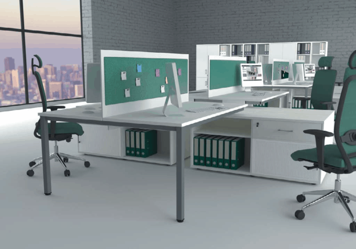 Biurka w tym systemie zbudowane są na stelażu ramowym o przekroju kwadratowym 50 mm x 50 mm, lakierowanym proszkowo. Dostępne są proste i kątowe blaty biurek oraz osłny biurek w dwóch wariantach: metalowe i płycinowe. Powierzchnię użytkową blatów łatwo można powiększyć stosując dostawki lub kontenery dostawiane do biurek. Biurka można zestawiać uzyskując różne, łatwe do rozbudowy stanowiska pracy (przykłady zestawień). Uzupełnieniem dla systemu są regały biurowe.