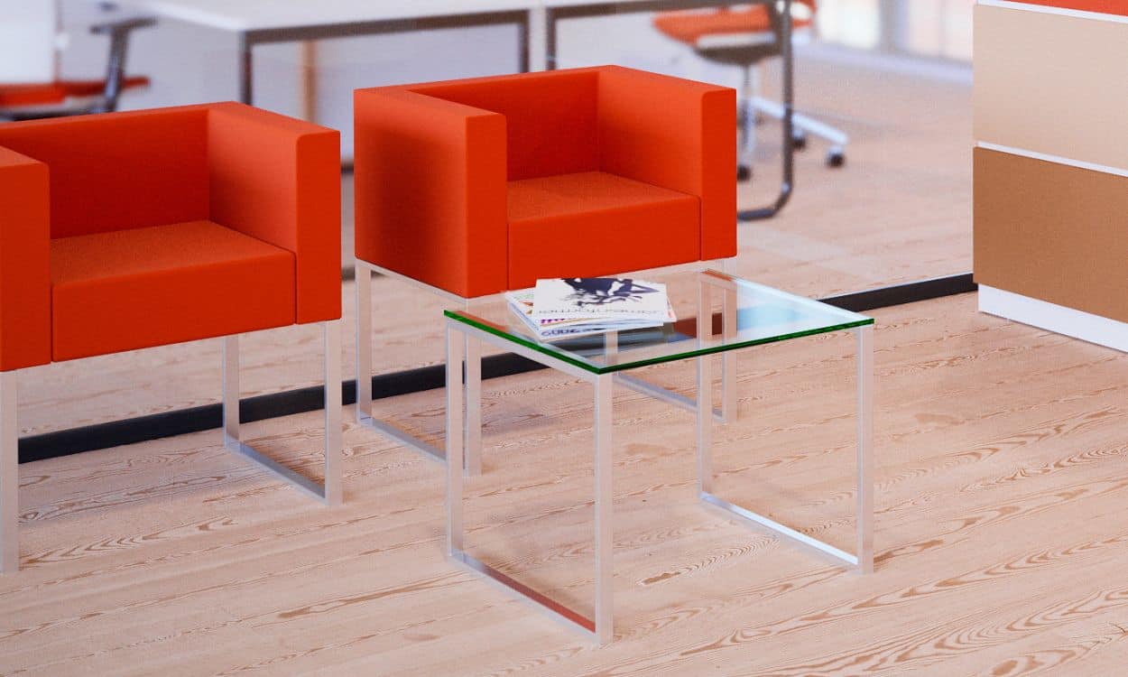 Stół ze szklanym blatem, podstawa chromowana lub malowana proszkowo.