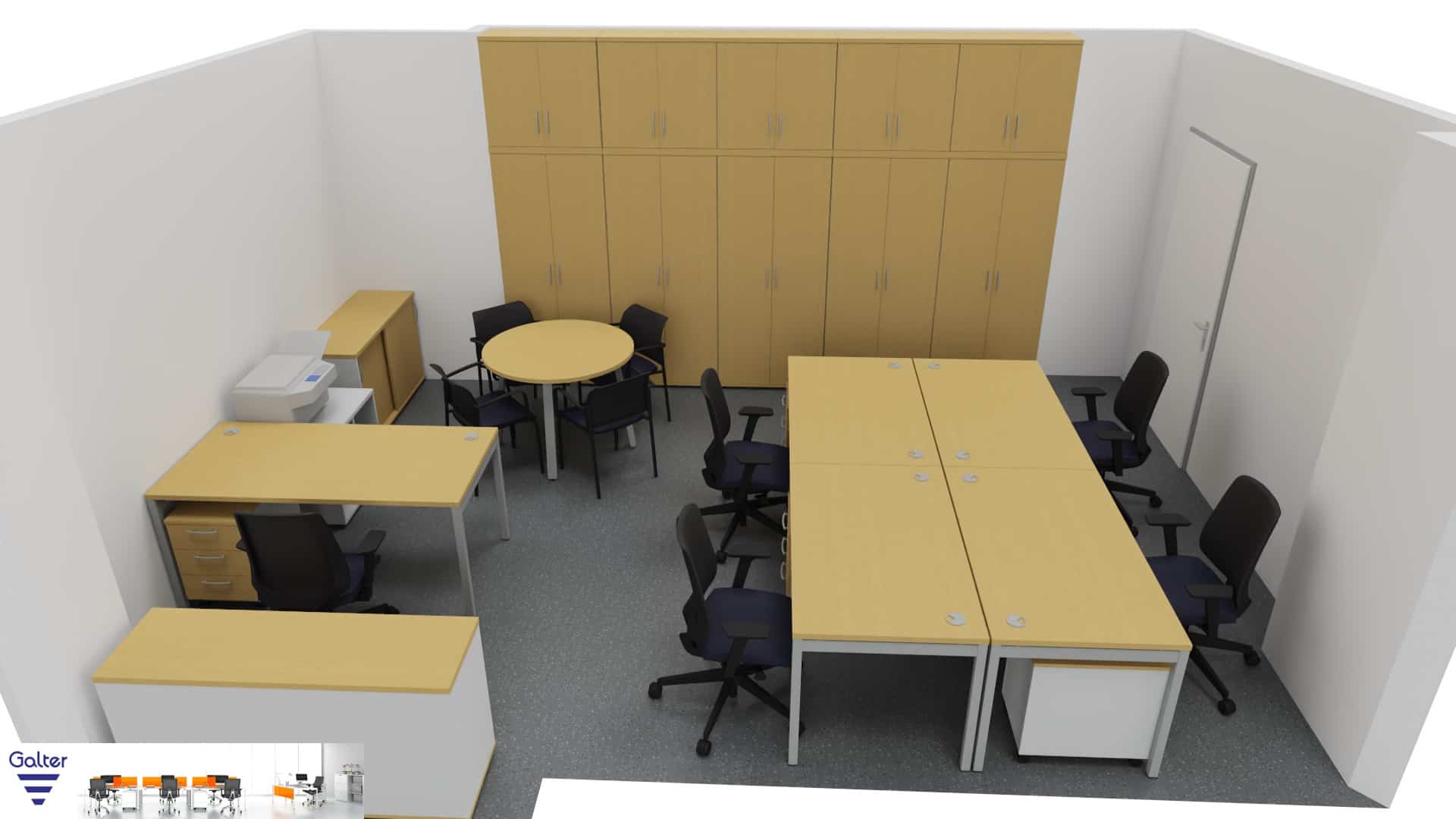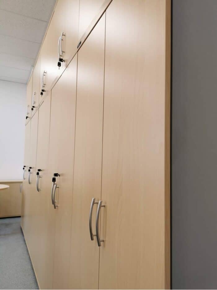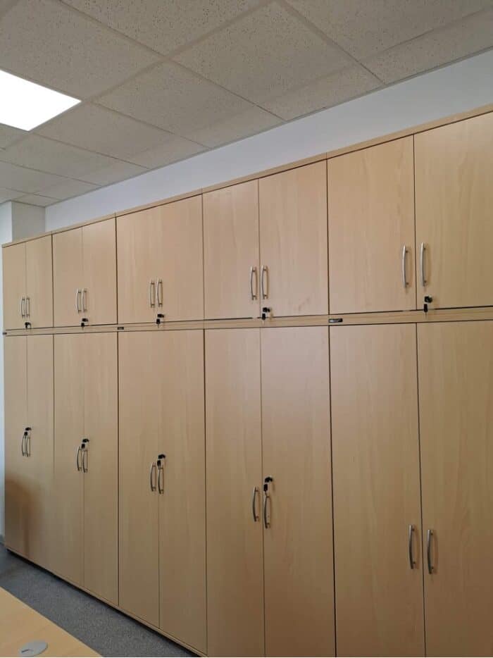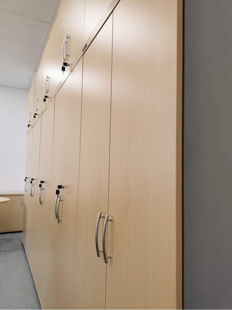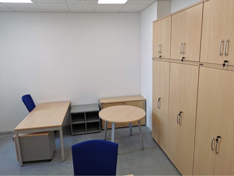 Przygotowaliśmy projekt biura firmy farmaceutycznej z Łodzi. W projekcie zaaranżowaliśmy 5 stanowisk pracowniczych, w tym jest zabudowa ściany szafami aktowymi i nadstawkami, a także szafki niskie z frontami przesuwnymi. Zajęliśmy się również kompleksowo transportem i montażem mebli. Wykorzystaliśmy meble z MDD i Grospolu.