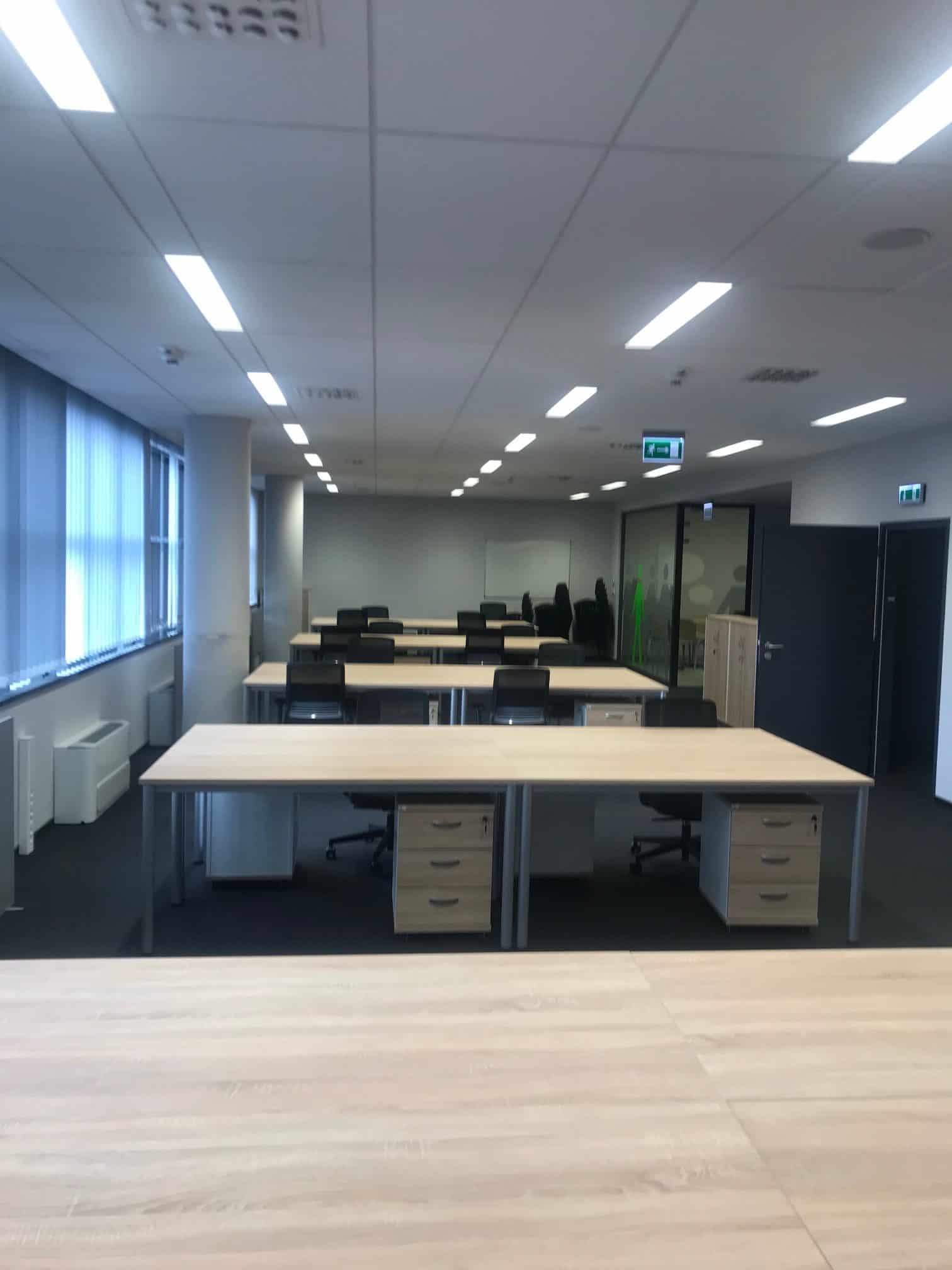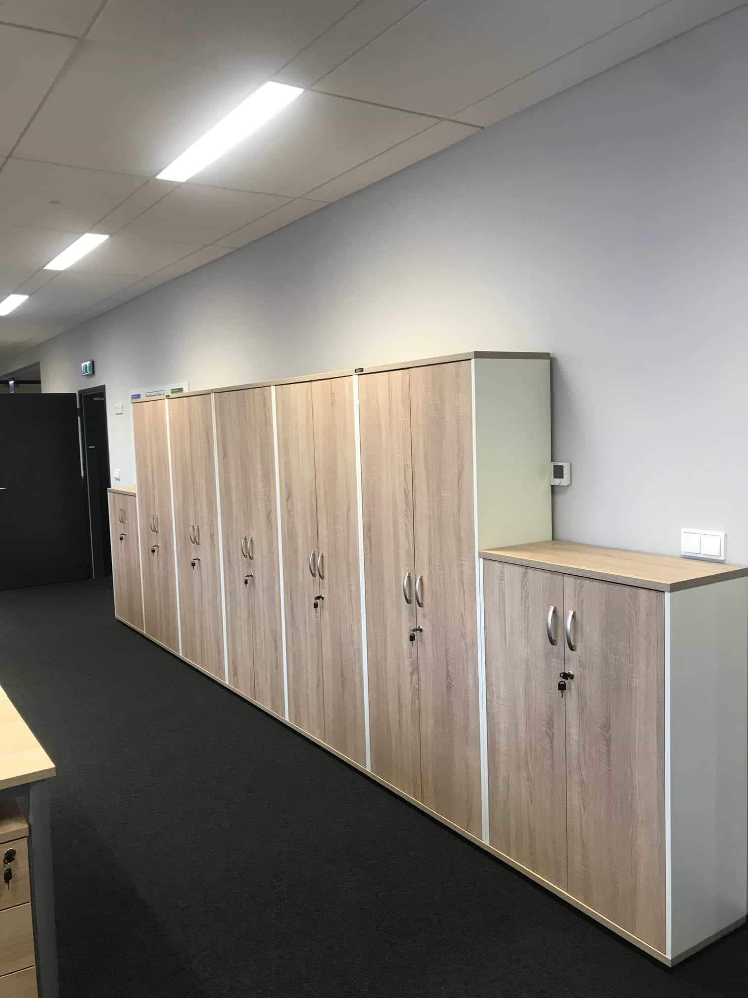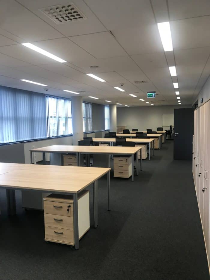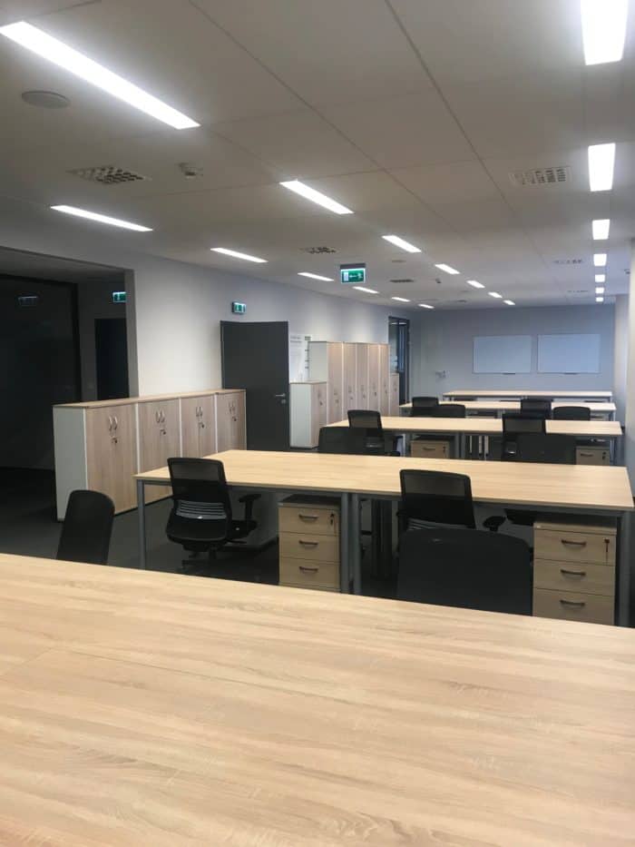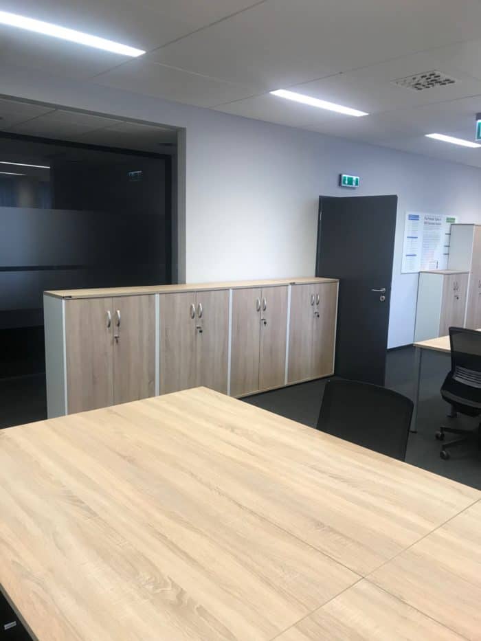 Meble wykorzystane w projekcie: 22 stanowiska pracownicze wraz z meblami uzupełniającymi: kontenery, szafki i krzesła.
