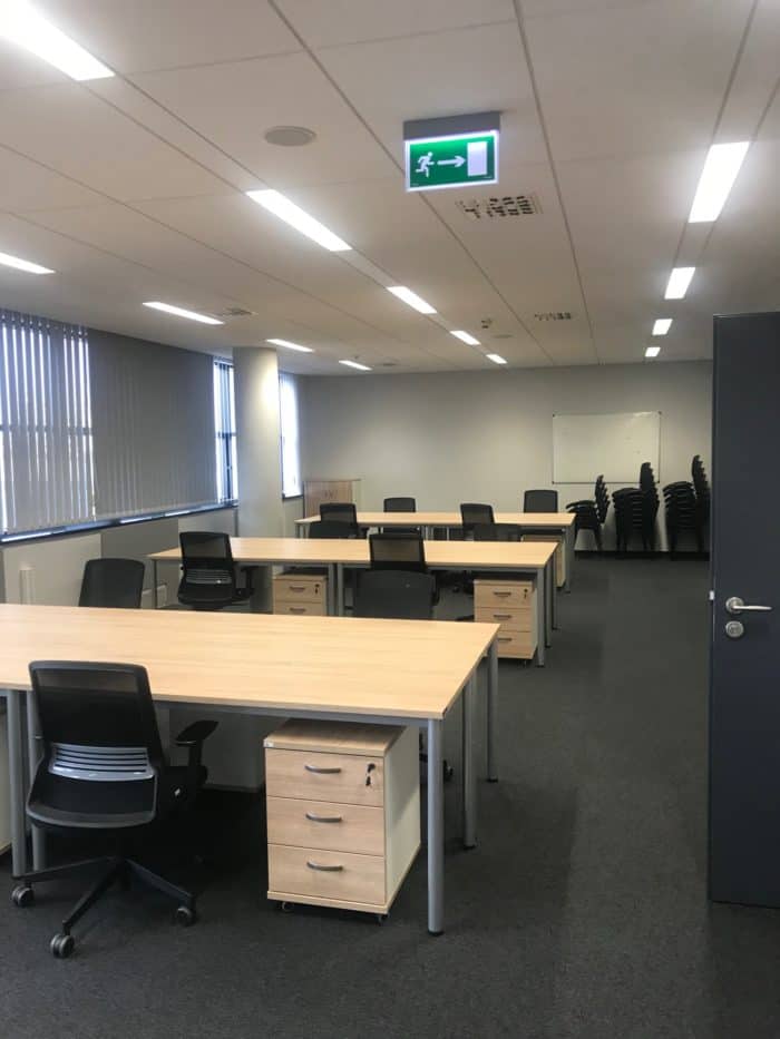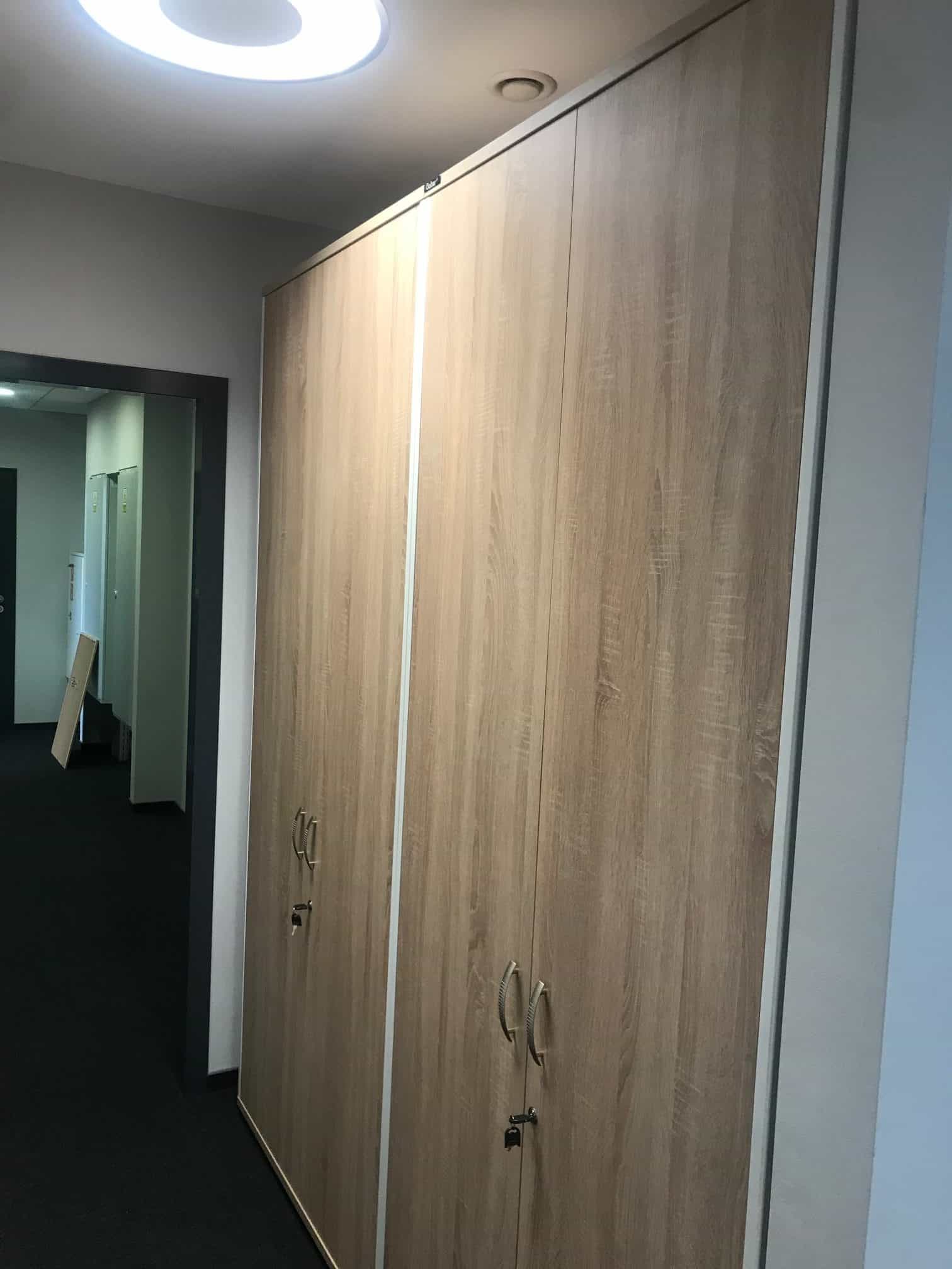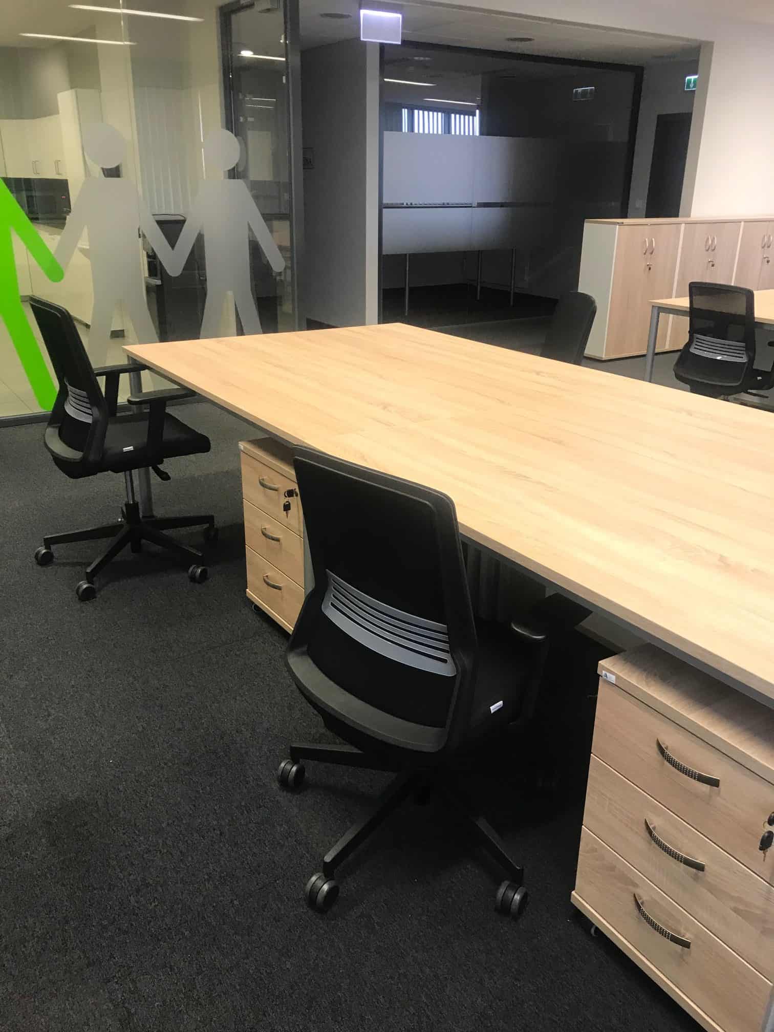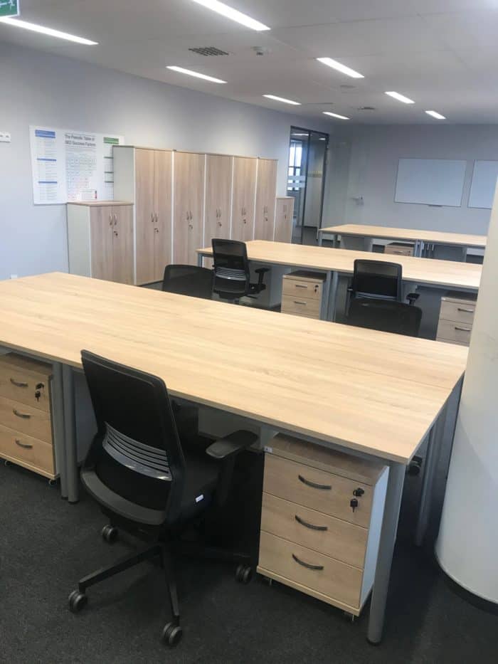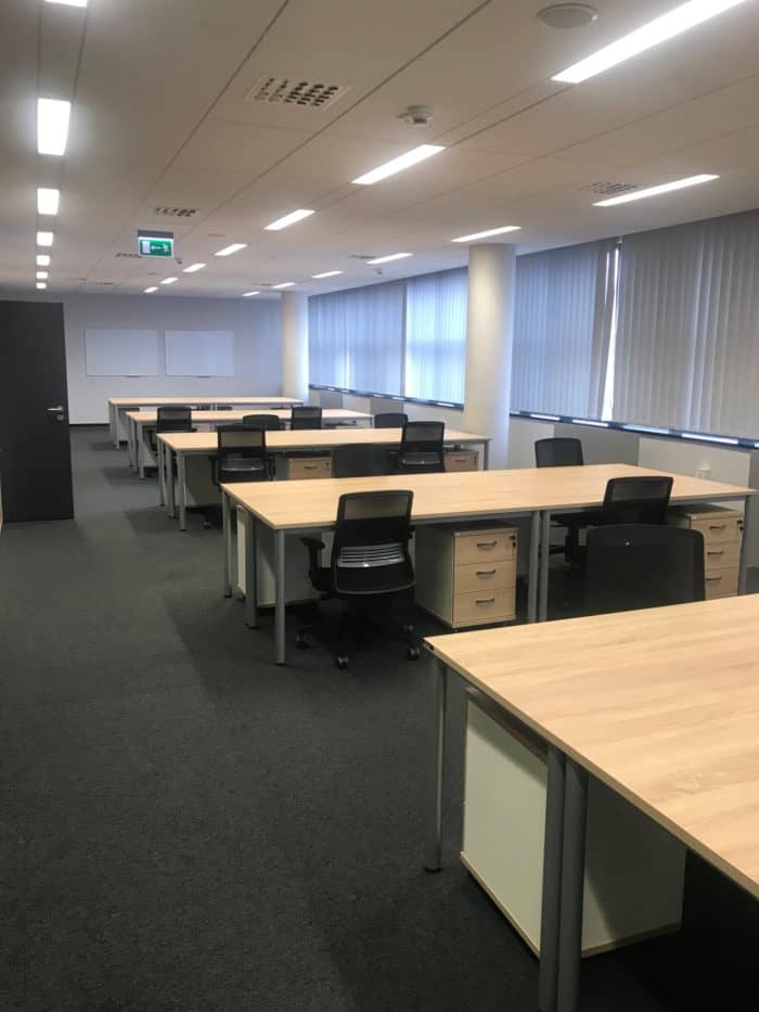 Meble wykorzystane w projekcie: 22 stanowiska pracownicze wraz z meblami uzupełniającymi: kontenery, szafki i krzesła.